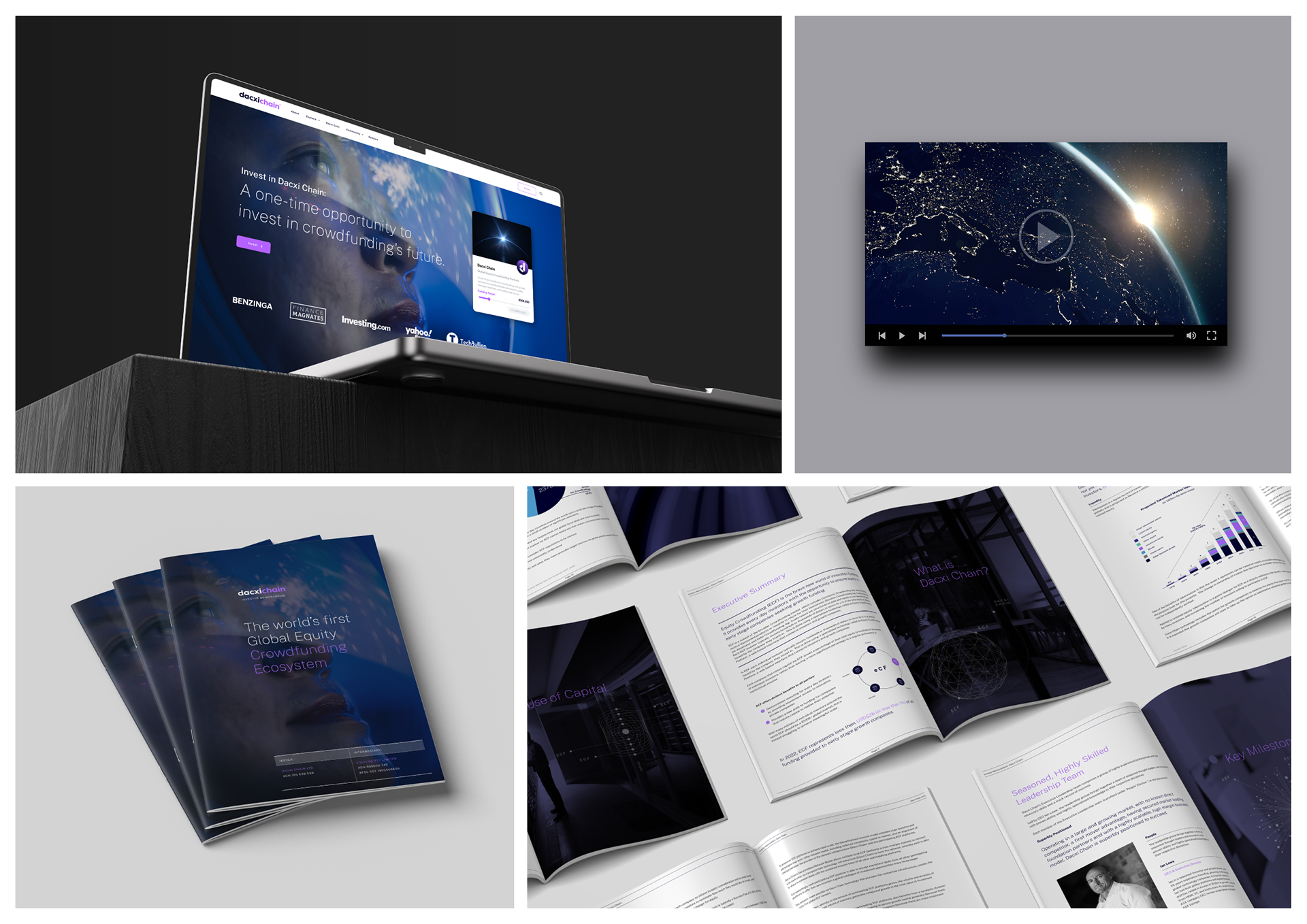As Art Director, I was responsible for defining and executing Dacxi Chain’s visual identity. I led the development of preliminary brand guidelines that brought cohesion and vibrancy to their website, videography, crowdfunding app, eBooks, and reports. The design approach reflected the platform's innovation while ensuring clarity and professionalism across all channels.
